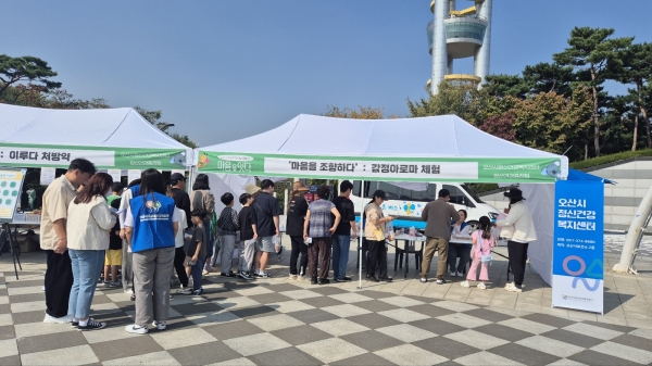 특히 4부 정신건강의 날 캠페인은 오산시민들의 우울감과 스트레스를 해소할 수 있도록 정신건강 선별검사, 감정 아로마 체험, 이루다 처방약, 걱정인형키트 만들기, 헤나스텐실 등의 다양한 체험부스로 진행됐다.