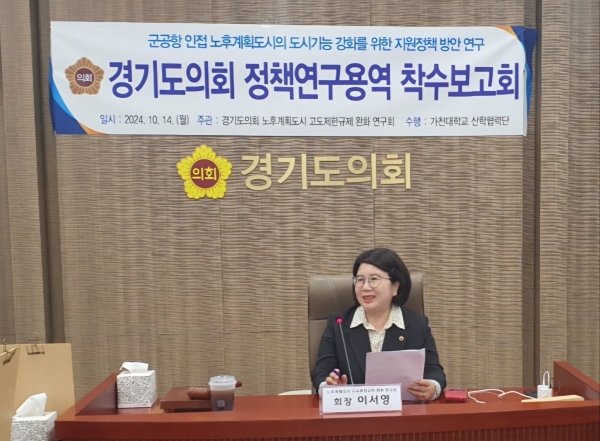 [금요저널] 경기도의회 교육행정위원회 이서영 의원은 고도제한 규제가 적용되는 지역의 도시기능을 강화하기 위한 ‘군공항 인접 노후계획도시의 도시기능 강화를 위한 지원 정책 방안 연구’의 착수보고회가 14일 교육행정위원회 회의실에서 개최했다고 밝혔다.
