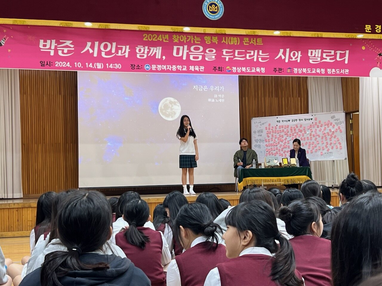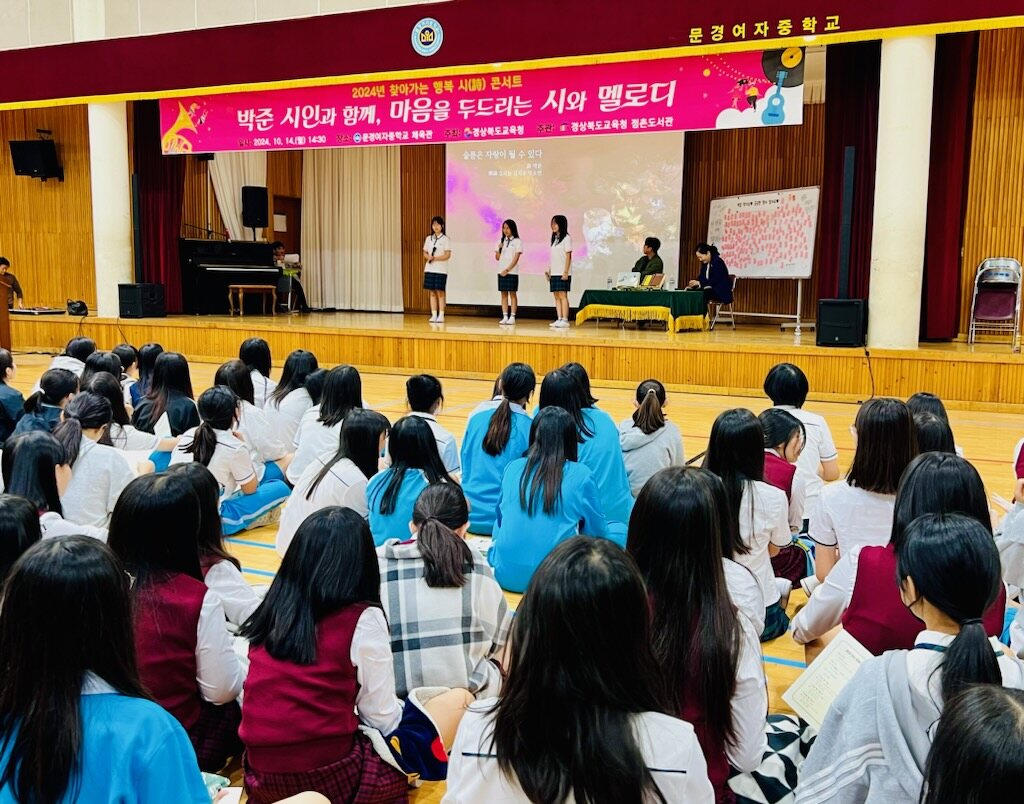 □ 경상북도교육청 점촌도서관(관장 박상선)은 지난 10월 14일(월) 문경여자중학교 1학년을 대상으로 ‘2024년 찾아가는 행복 시(詩) 콘서트’를 성황리에 개최했다고 밝혔다.