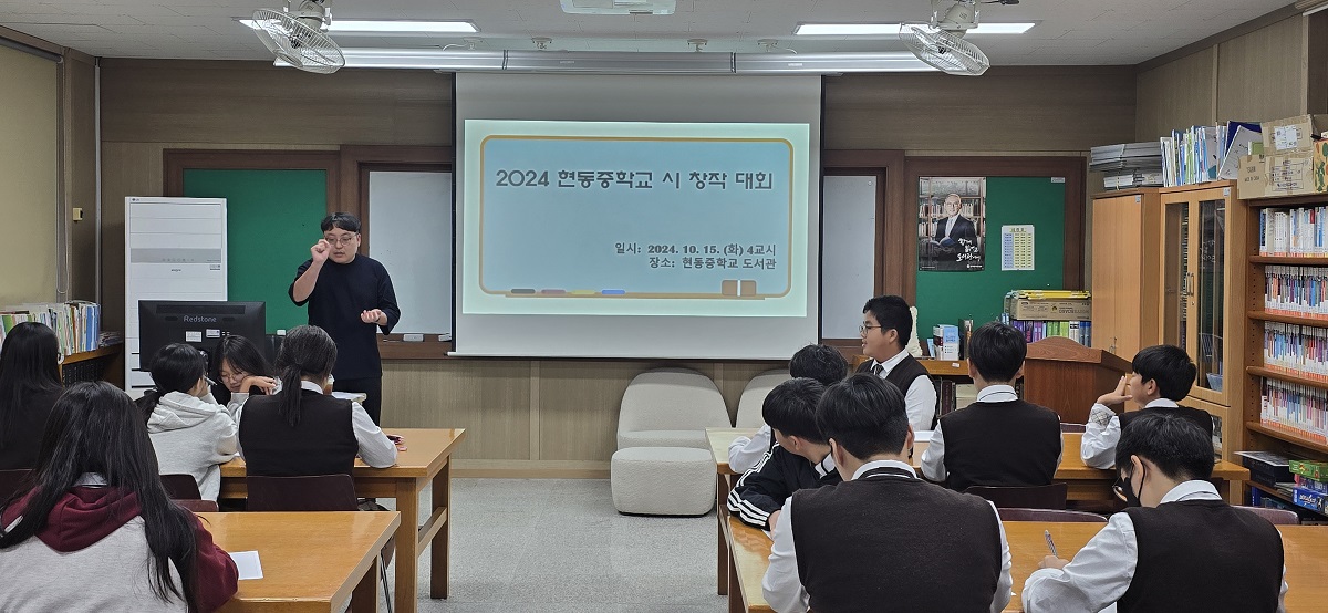 - 현동중학교(교장 김양훈)는 10월 15일(화) 4교시에 본교 도서관에서 전교생을 대상으로 교내 시 창작 대회를 실시하였다. 진행은 본교 국어교사 박○○선생님이 진행하였다.