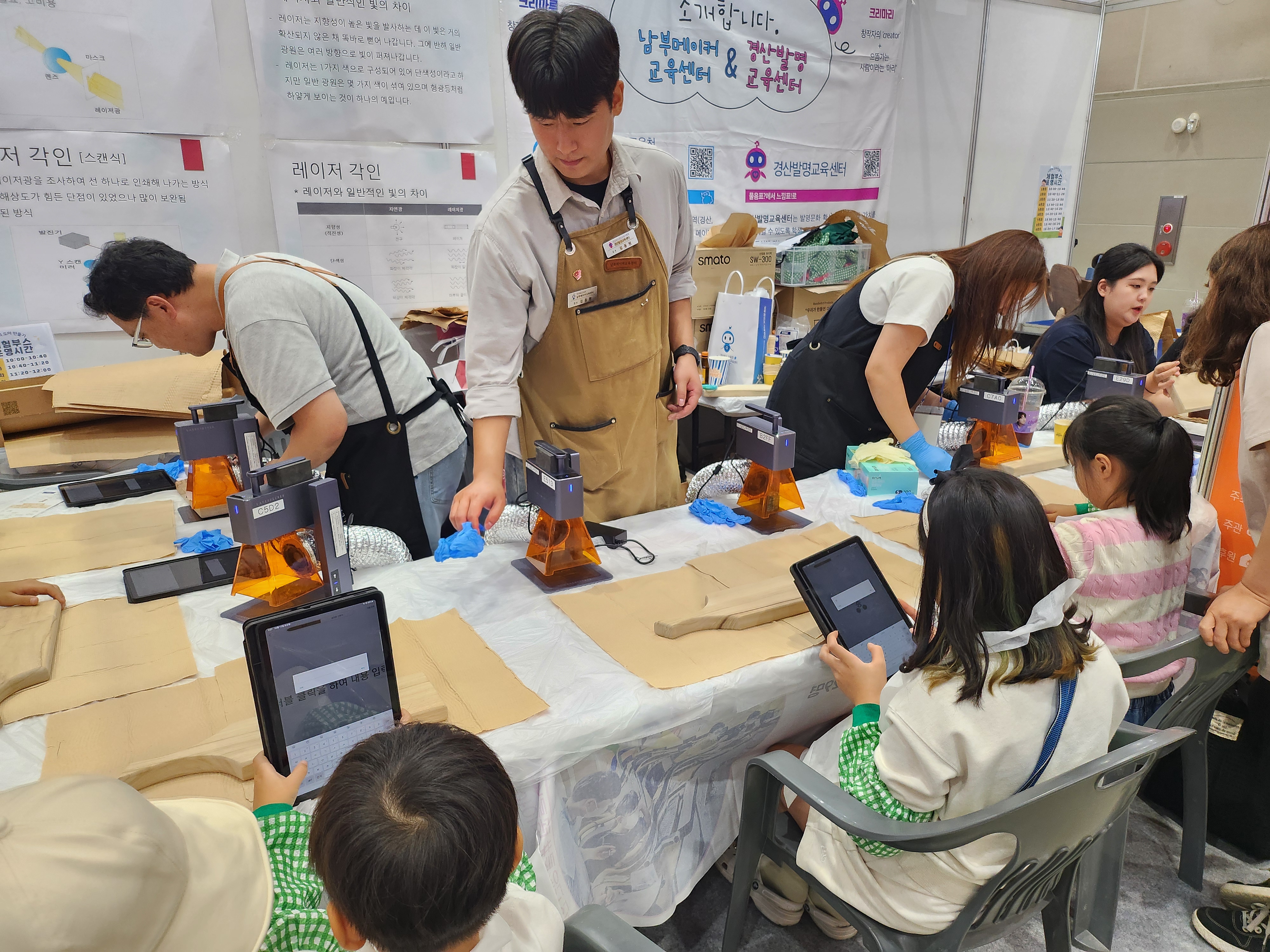□ 부스는 레이저각인기를 이용한 나만의 도마만들기 체험을 운영한다. 빛과 열에 관련이 되어있는 레이저 각인기를 통하여 레이저의 원리를 알려주고 도마에 직접 쓰고 싶은 문구나 글귀를 새기는 활동을 한다.