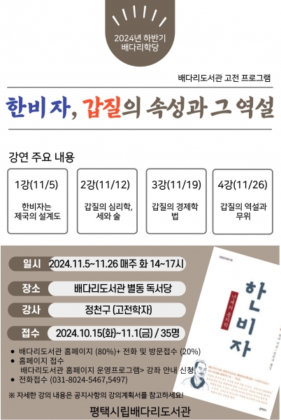 이번 하반기 배다리학당은 ‘한비자, 갑질의 속성과 그 역설’을 주제로 인간사회에서 한결같이 작동하는 이익 추구와 힘의 논리, 이에 따른 ‘갑질’의 속성과 그 역설을 통찰하며 다양한 사례를 들어 풀이하고 음미하게 하려는 것이 목표이다.