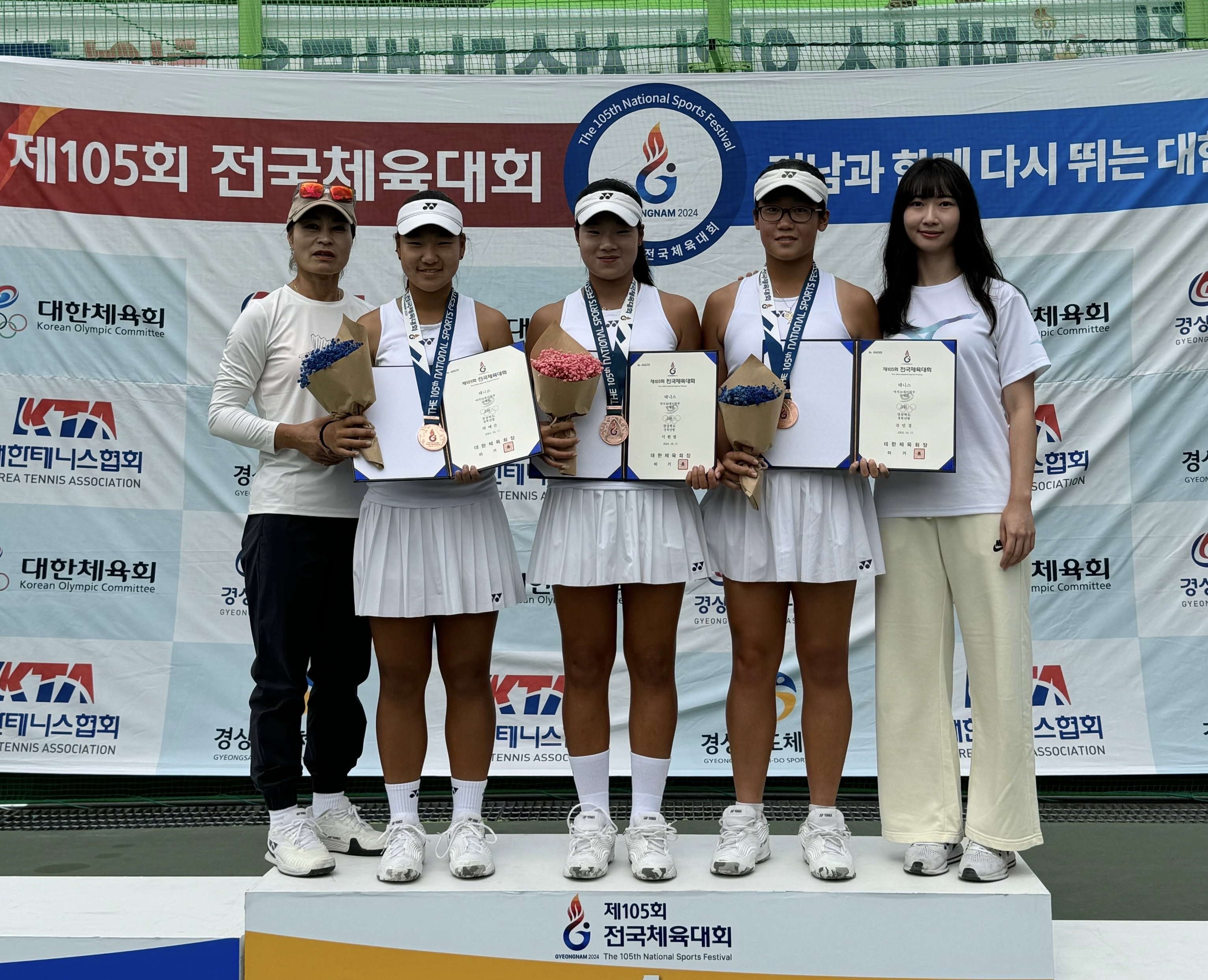 장유 능동 테니스 경기장에서 개최된 테니스부 단체전에서 이한별(3학년), 김민경(2학년), 박예은(1학년) 선수는 경산여고 신정아 선수와 함께 경북팀으로 출전해 치열한 경기 속에서 최선을 다해 동메달을 획득하였다.