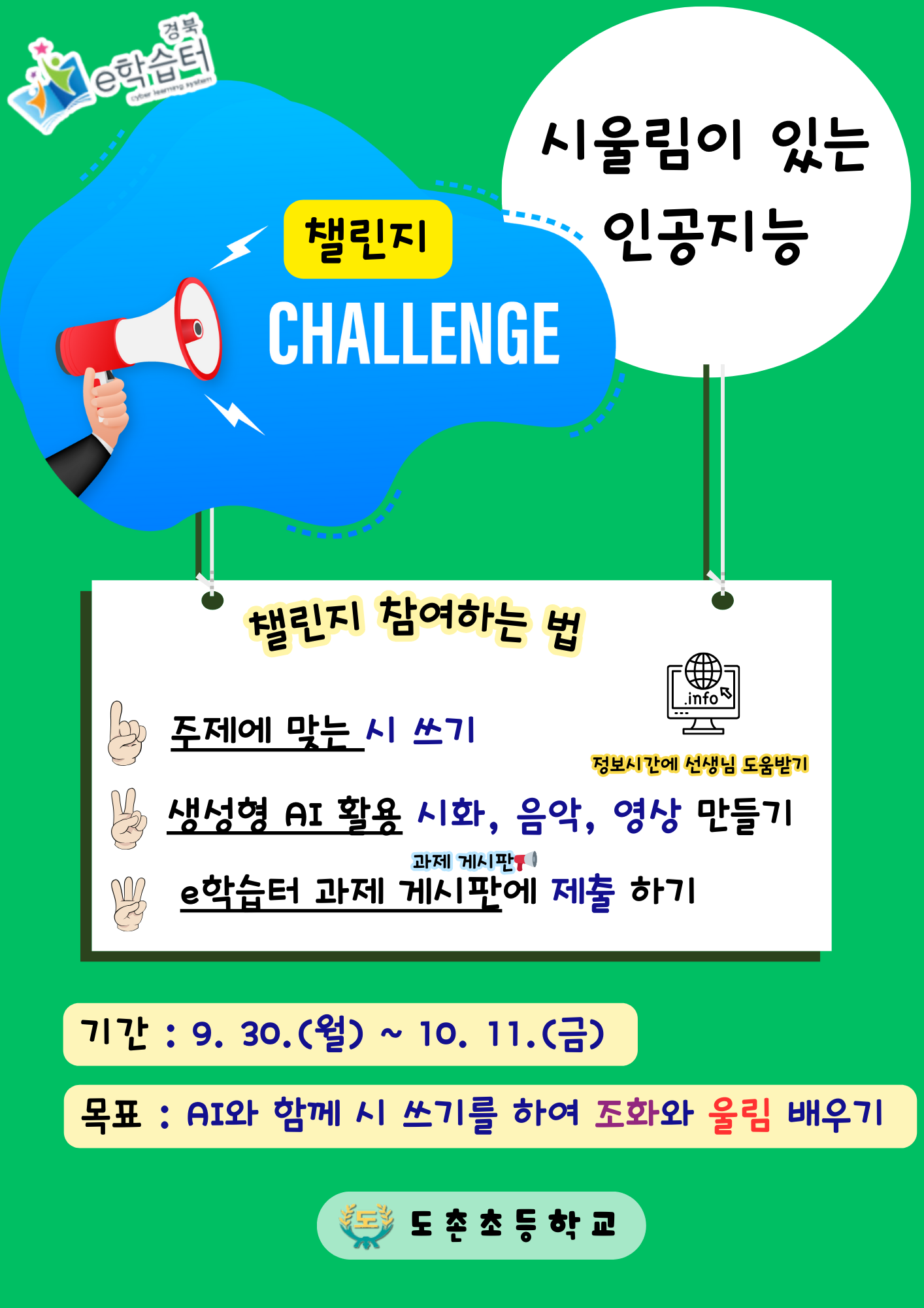 □ 지난 9. 30.(월) ~ 10. 11.(금) 기간 동안 시울림이 있는 인공지능 챌린지를 운영하였다. 학생들은 식생활을 주제로 시를 쓰고, 학년군별로 인공지능을 활용한 챌린지를 진행하였다. 모든 학급이 경상북도교육청 지정 e학습터 선도학급에 지정되어 있어, e학습터를 활용하여 더욱 체계적인 활동을 할 수 있었다.