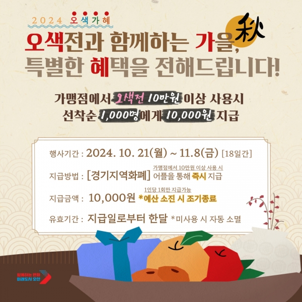 [금요저널] 오산시는 2024년 가을을 맞아 이달 21일부터 다음 달 8일까지 오색전 사용자를 대상으로 오색전 가맹점에서 누적금액 10만원 이상 사용 시 선착순 1,000명에게 1만원의 혜택을 제공하는 이벤트를 실시한다.