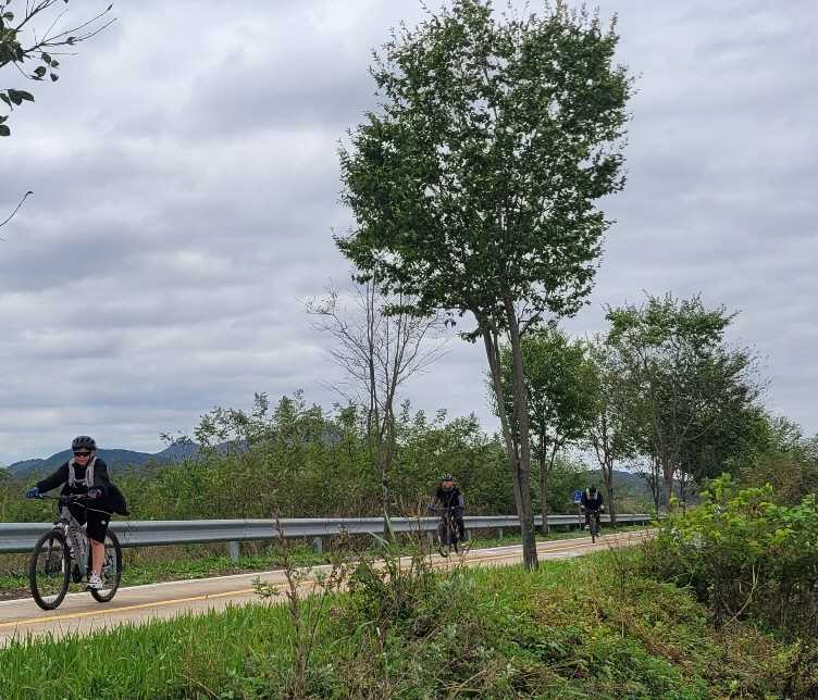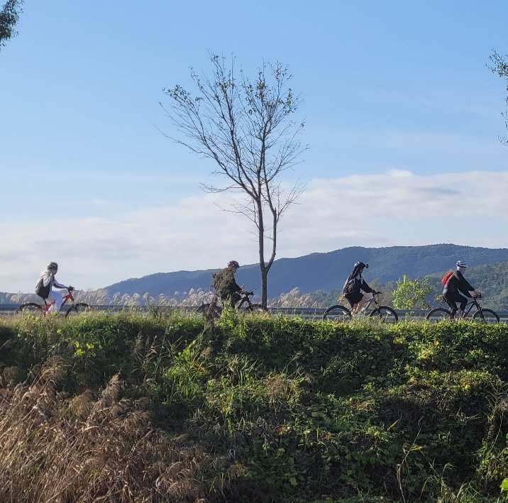 □ 높고 청명한 하늘 아래 유유히 흐르는 낙동강을 끼고 자전거로 달리는 코스를 정하였는데, 풍천면 구담교 낙동강자전거길을 기점으로 정훈모 선생 기념비를 목표지접으로 하여 다시 돌아노는 왕복 40km를 자전거로 달렸다. 1차 라이딩에서 24km를 달렸던 학생들은 아침시간마다 학년별로 운동장을 자전거로 달리며 갈고 닦은 실력으로 16km를 더 주행해냈다.