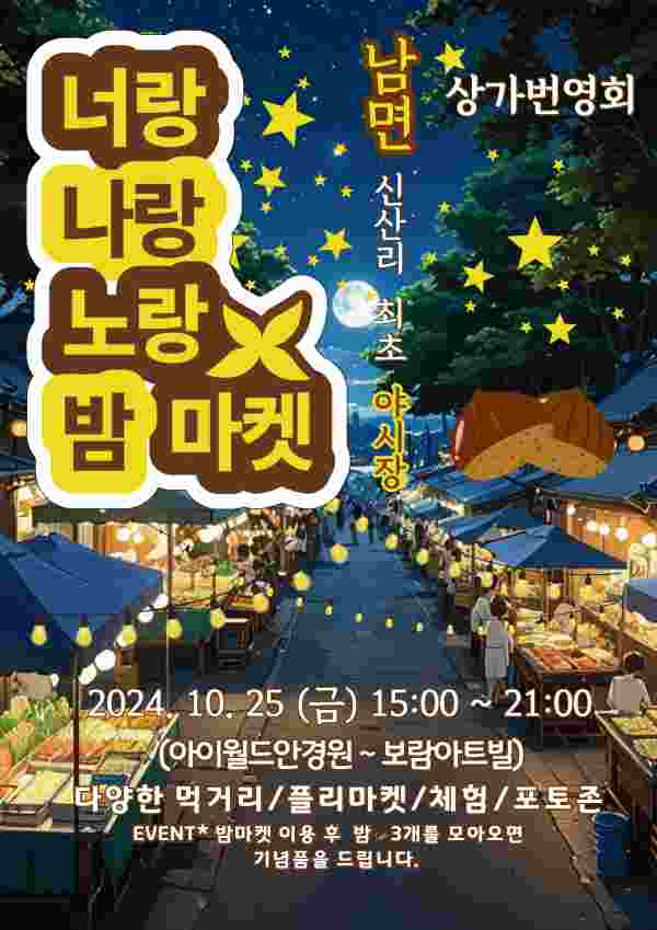 시가 주최하고 ‘신산시장마을번영회’ 가 주관한 이번 축제는 올해 6월 성황리 막을 내린 ‘너랑나랑노랑 축제’의 연장선으로 남면 신산리 지역주민의 화합과 지역 상권 활성화를 도모하기 위해 마련됐다.