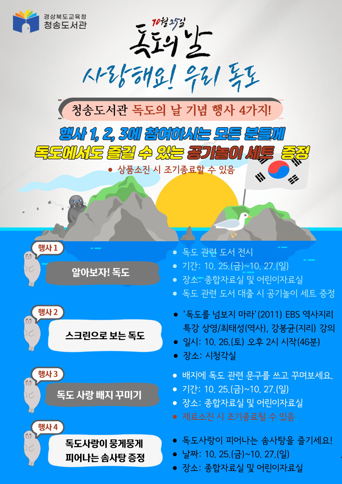 독도의 날은 독도가 대한민국 영토임을 천명한 날을 기념하기 위해 제정된 날로, 청송도서관은 이 날을 맞아 독도가 우리 땅이라는 사실을 다시 한번 되새기며 독도의 가치를 알리고자 10월 25일(금)~10월 27일(일)까지 독도 관련 행사를 실시한다.