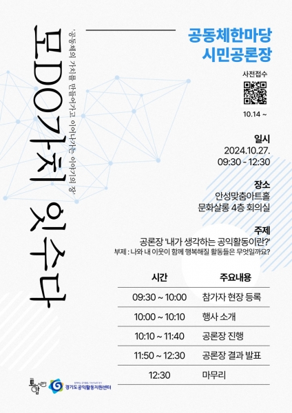 또한, 아트홀 4층 문화살롱에서는 ‘공익활동, 이렇게 하자’라는 주제로 50여명의 시민이 함께 안성에 맞는 공익활동의 방향에 대한 토론이 진행된다.