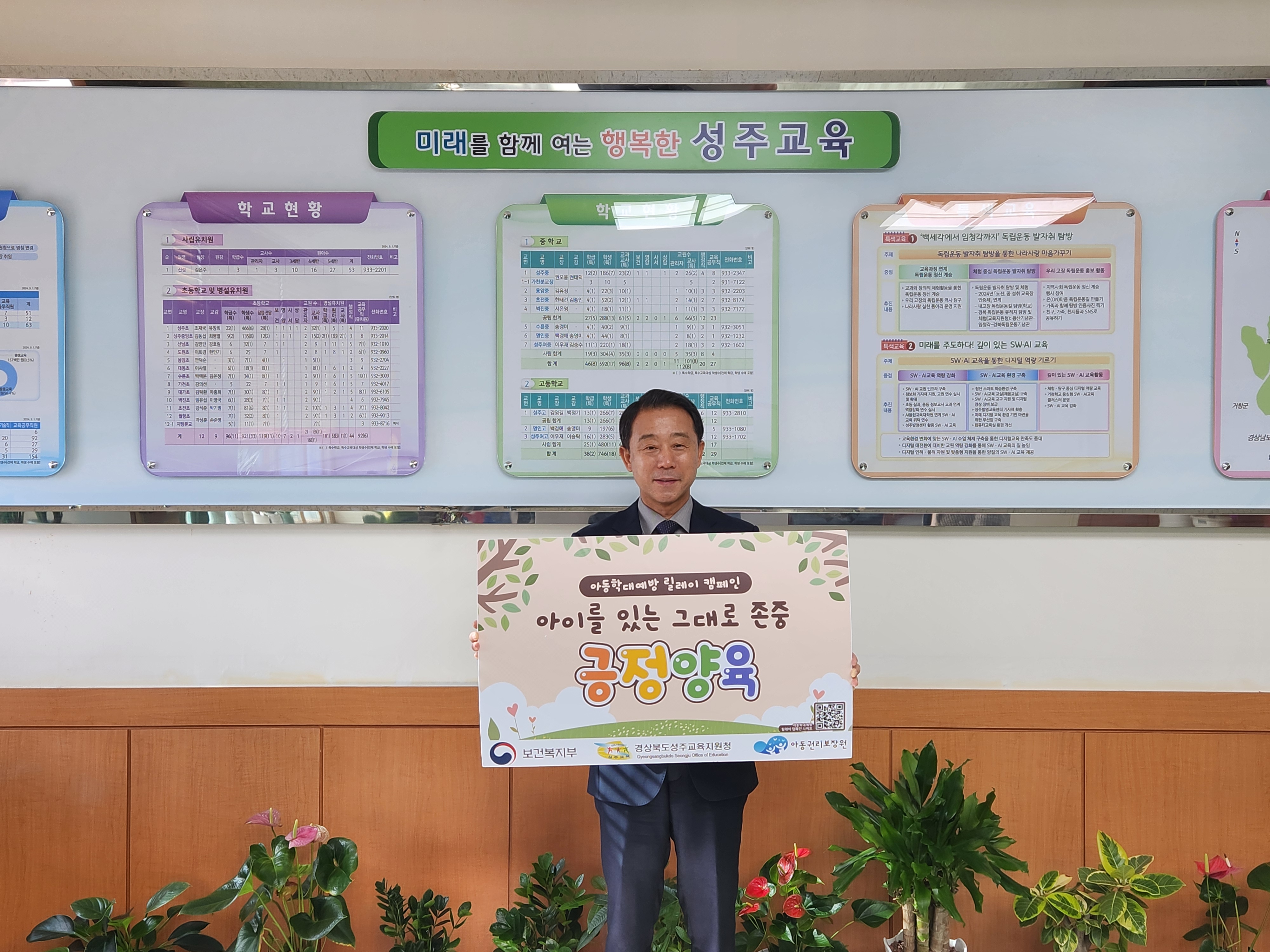 □ 경상북도성주교육지원청 정수권 교육장은 10월 23일(수) ‘아이를 있는 그대로 존중, 긍정양육’을 주제로 진행중인 아동학대예방 릴레이 캠페인에 동참했다.