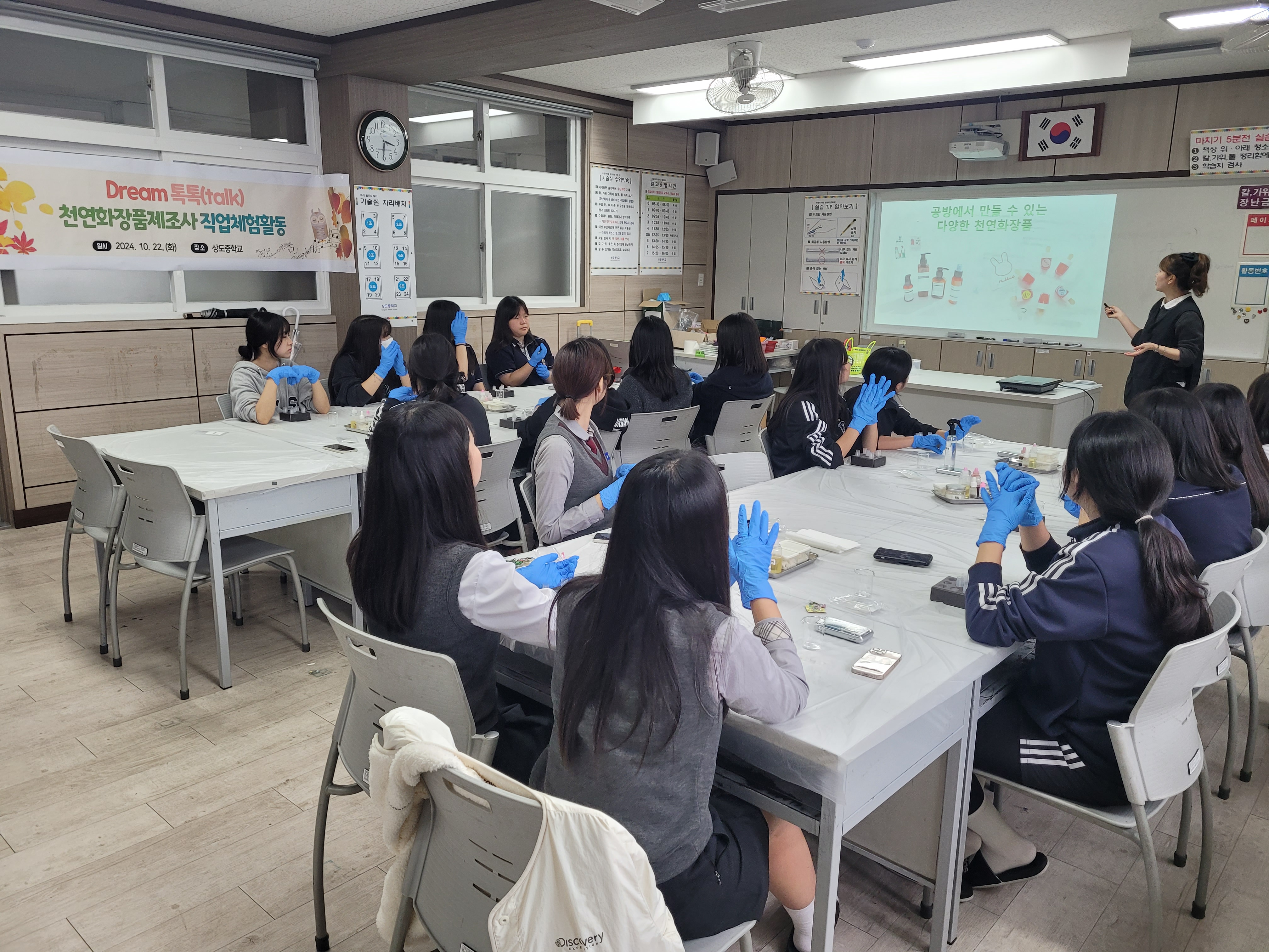 활동에 참여한 3학년 김◯◯ 학생은“예전부터 관심있었던 천연화장품제조사와 관련된 직업세계를 직접 체험해봐서 매우 좋은 시간이었다. 내가 직접 천연화장품을 만들 수 있는 기회가 되어서 좋았다. 판매하는 화장품에는 화학제품이 많다는 것도 놀랐고, 앞으로 화장품을 살 때도 성분표를 확인해보고 구입해야겠다.”고 소감을 밝혔다.