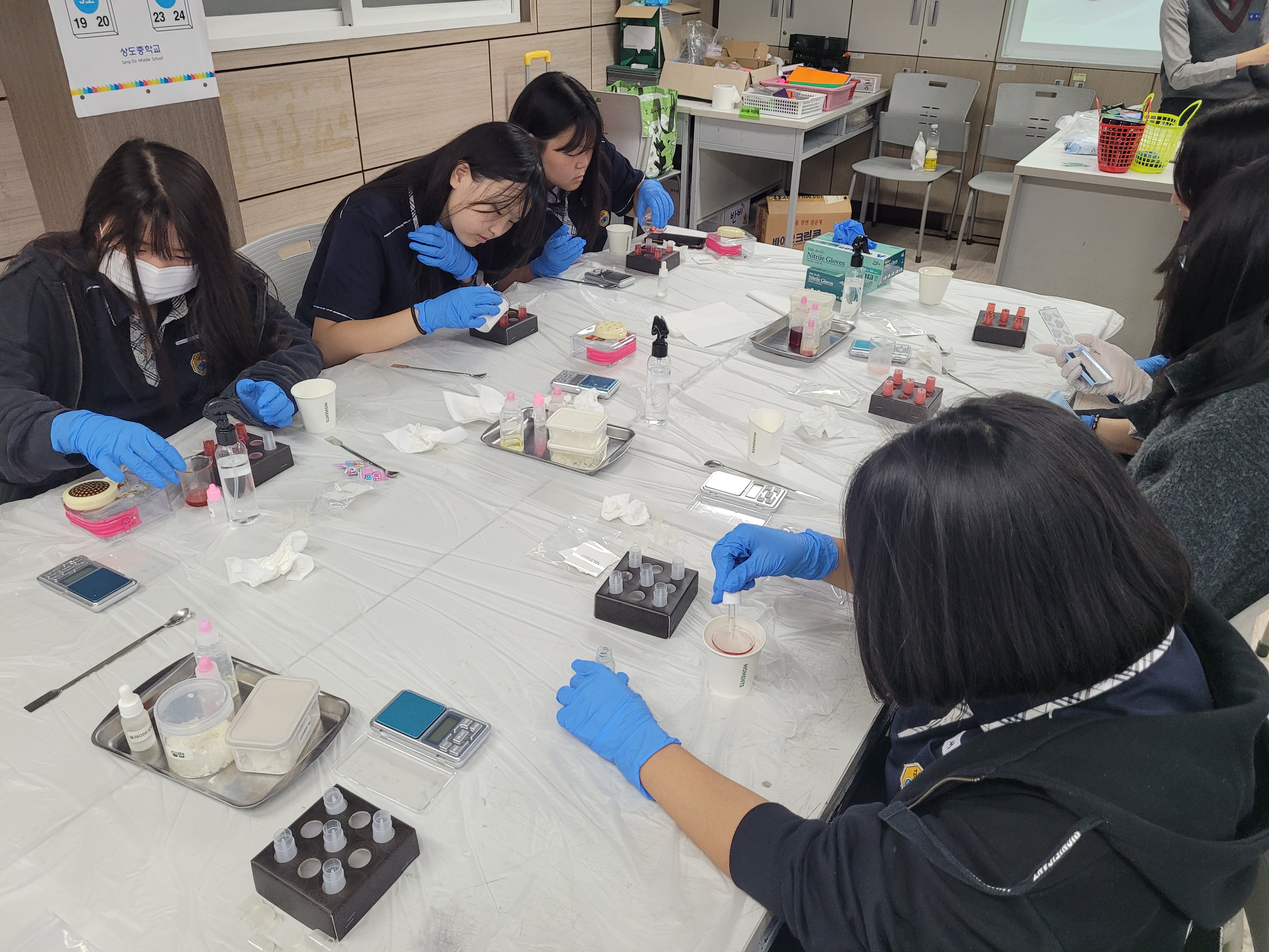 상도중학교(교장 최인호)는 10월 22일(화) 교육복지우선지원사업의 일환으로 1~3학년 학생 17명이 참여해 <Dream 톡톡(talk) 천연화장품제조사 직업체험활동> 프로그램을 실시했다.