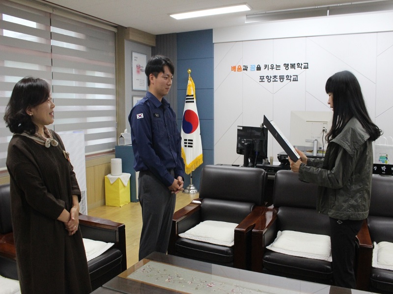 포항초등학교 관계자는 “심진섭 사회복무요원이 성실한 자세와 따뜻한 성품으로 복무에 임하고 있고, 방과후 활동 지원 등 여러 임무에 적극적으로 임하고 타의 모범이 되어 이번 표창 대상자로 추천하게 되었다.”라고 했다.