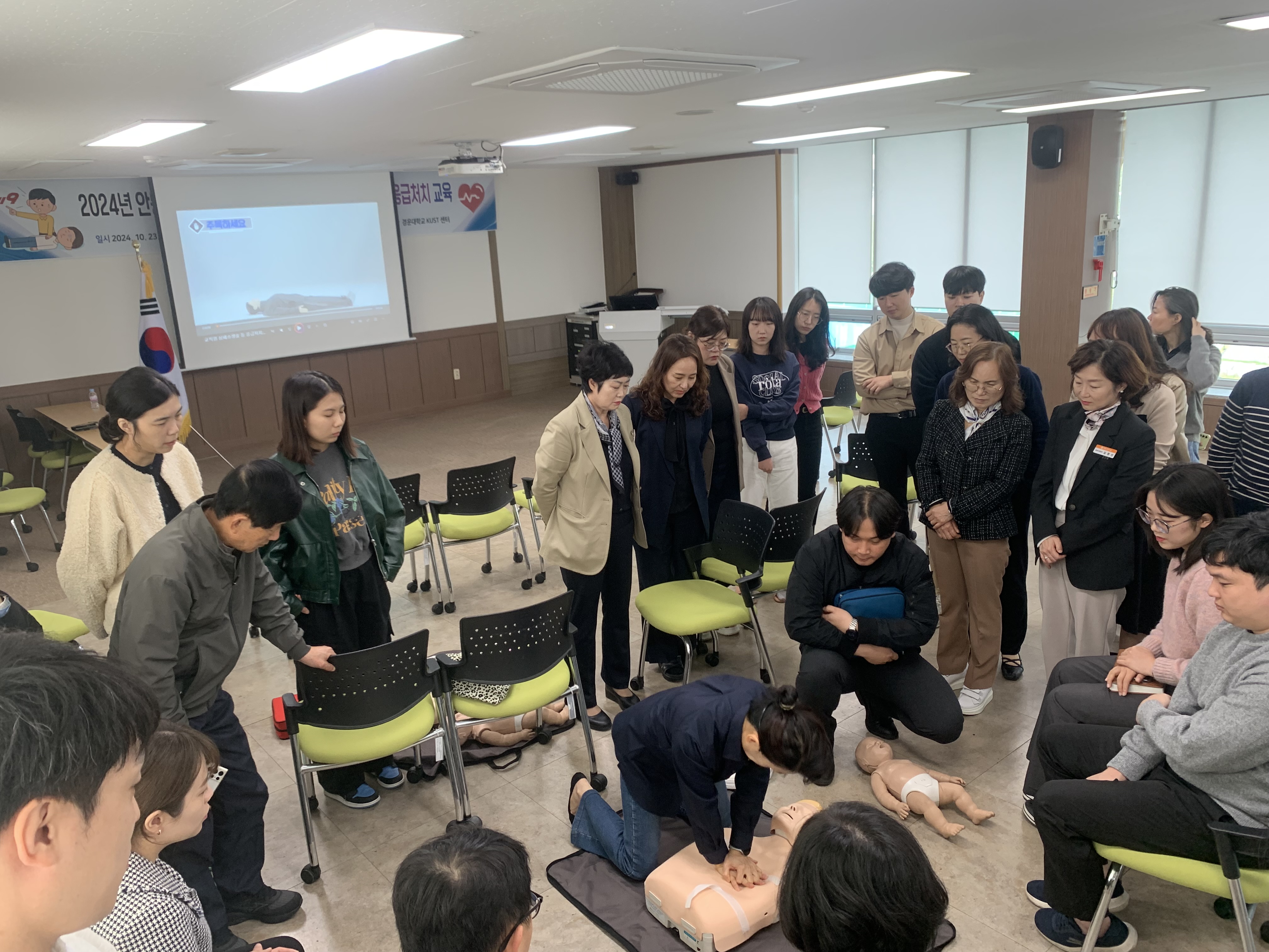 이날 교육은 BLS 교육 강사 자격을 갖춘 경운대학교 간호보건대학장(국가응급재난교육원장) 권려원 교수의 지도로 교육용 마네킹을