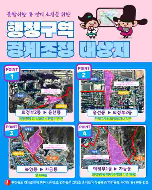 개정안은 △의정부2동에서 흥선동 편입 △흥선동에서 의정부2동 편입 △녹양동에서 자금동 편입 △의정부1동에서 가능동 편입 등 총 4개 구역의 행정동의 경계를 조정하는 내용을 담았다.