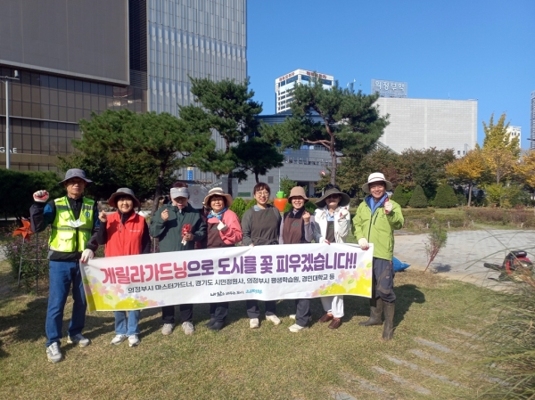 [금요저널] 의정부시는 마스터가드너가 10월 24일 시민과 함께 역전근린공원에서 ‘게릴라 가드닝으로 도시를 꽃 피우겠습니다’라는 구호 아래 환경정비를 실시했다고 밝혔다.