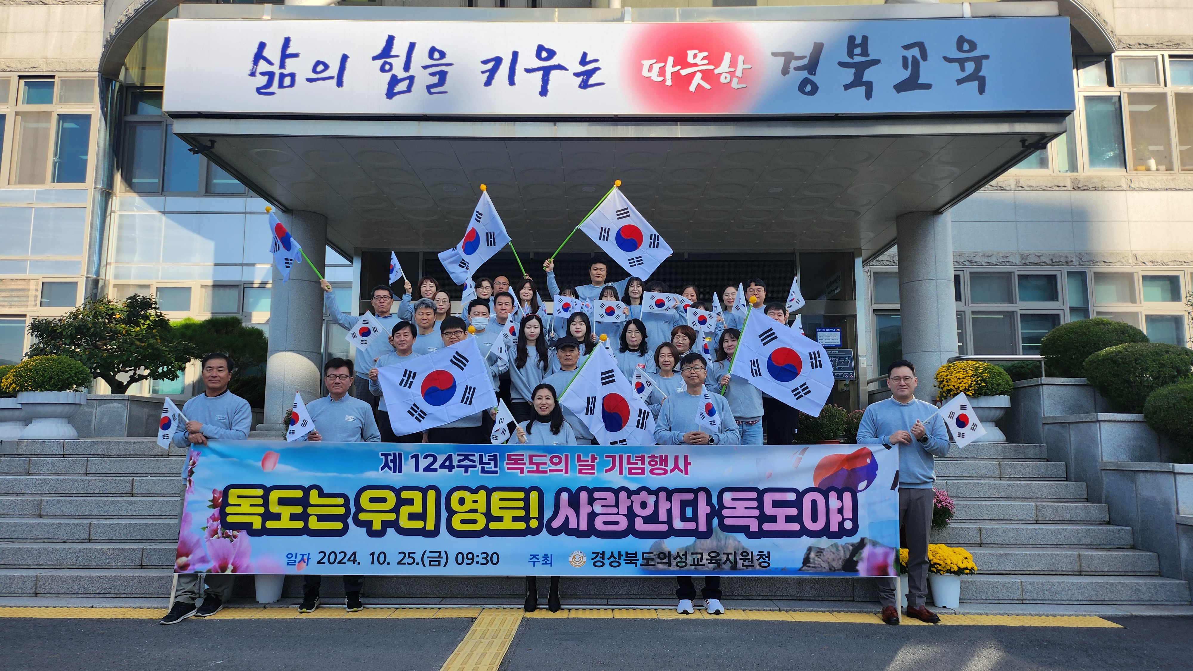 경상북도의성교육지원청(교육장 이우식)은 10월 25일(금) 오전 10시 교육지원청 앞에서 직원 60여 명이 참가한 가운데 독도의 날 행사를 열었다. 행사는 독도 사랑을 위한 다짐과 기념사진 촬영 등으로 이루어졌다.