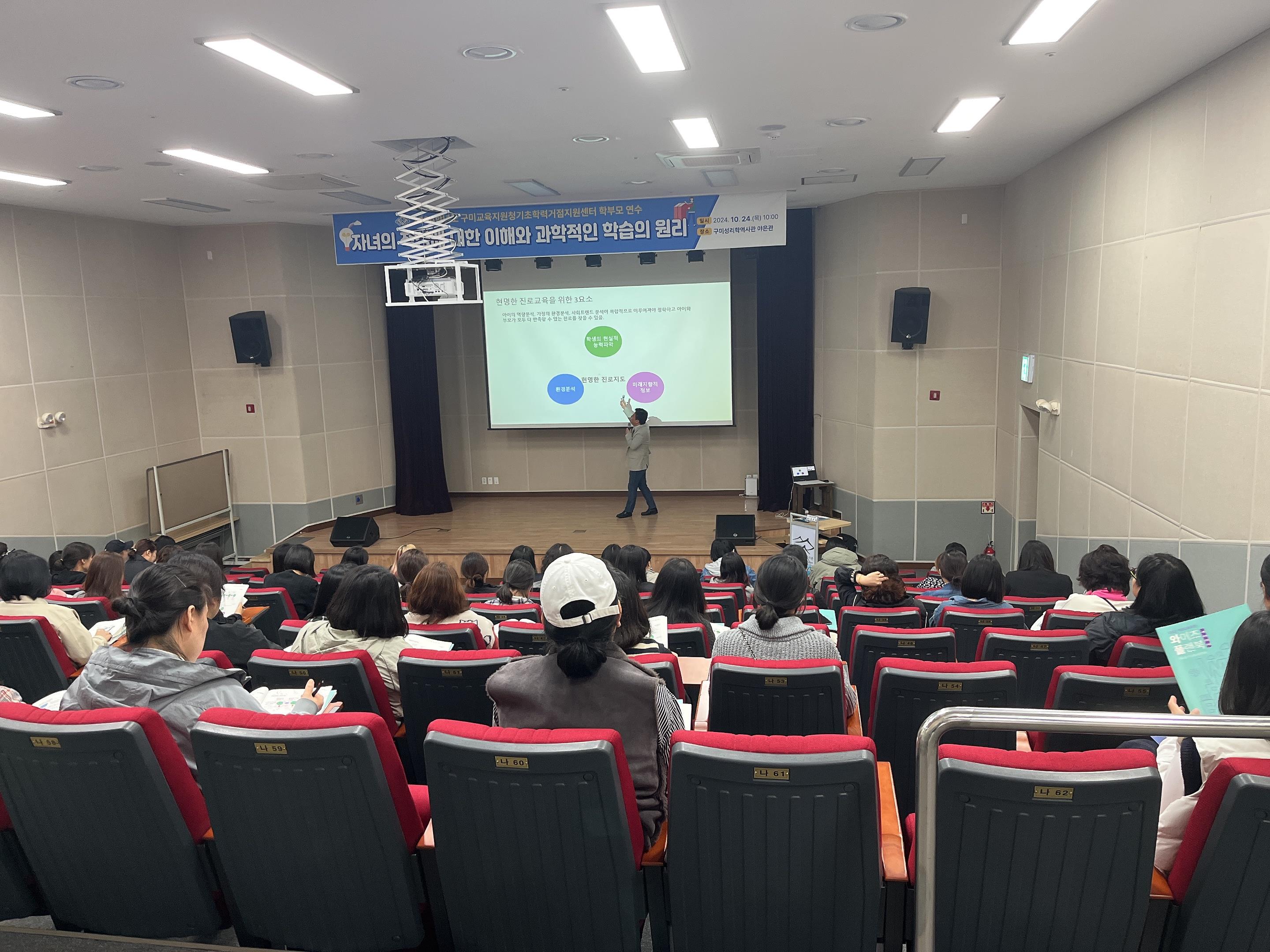 □ 경상북도구미교육지원청(교육장 남성관) 기초학력거점지원센터는 10월 24일(목) 구미, 김천 지역 초등학생 학부모 120명을 대상으로 진로교육 연수를 실시하였다.
