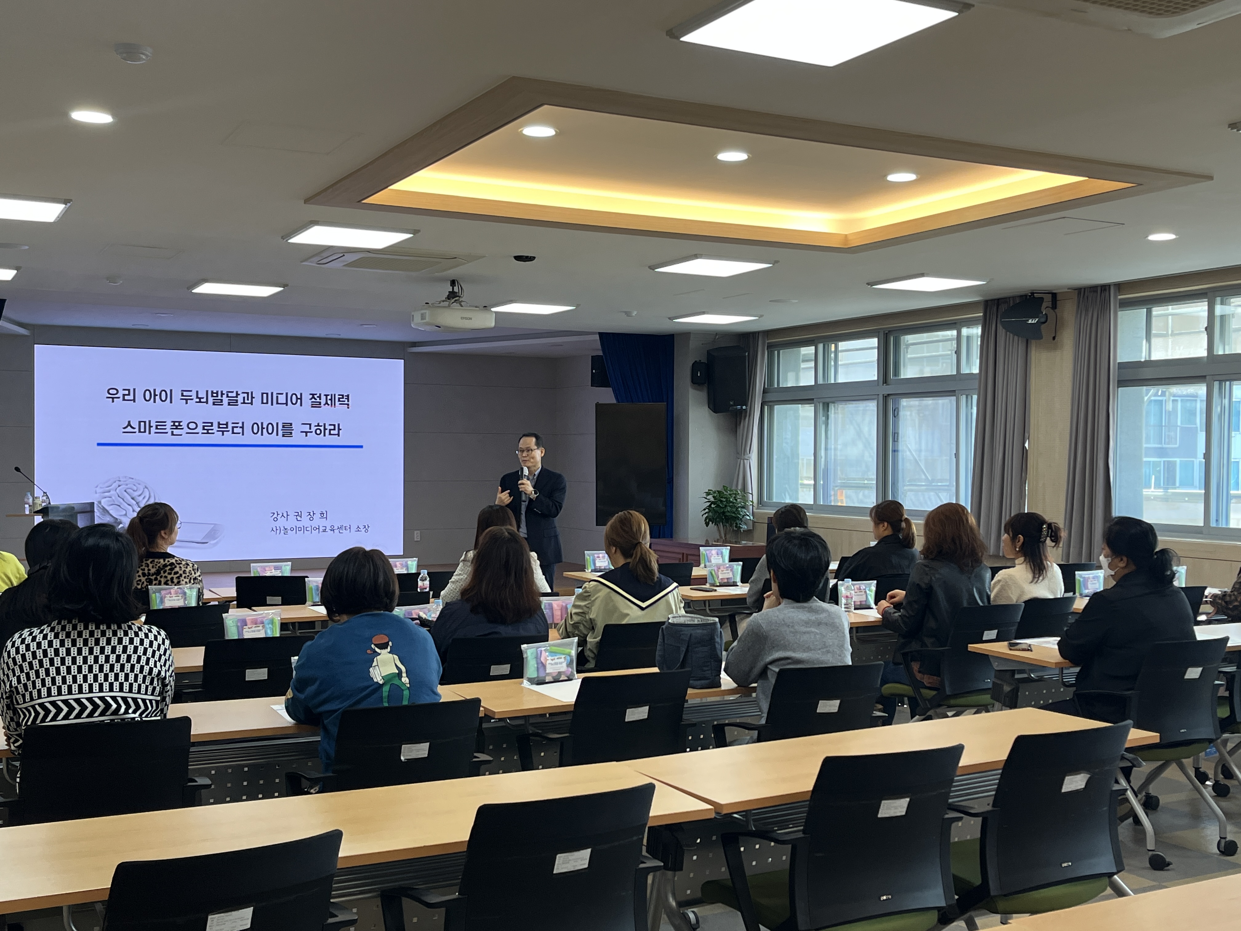 연수 강의는 '스마트폰으로부터 아이를 구하라'로 세바시 특강100만뷰를 달성한 (사) 놀이미디어교육센터 권장희 강사님이 교사 대상으로 ‘영상미디어가 고차원적 사고력에 미치는 영향과 교사의 역할’ 및 학부모 대상으로 ‘스마트미디어 시대, 두뇌 발달과 미디어 절제력키우기’라는 주제로 인터넷·게임·스마트폰 과의존의 원인과 예방 및 대처 방법에 대한 내용을 중심으로 진행됐다.