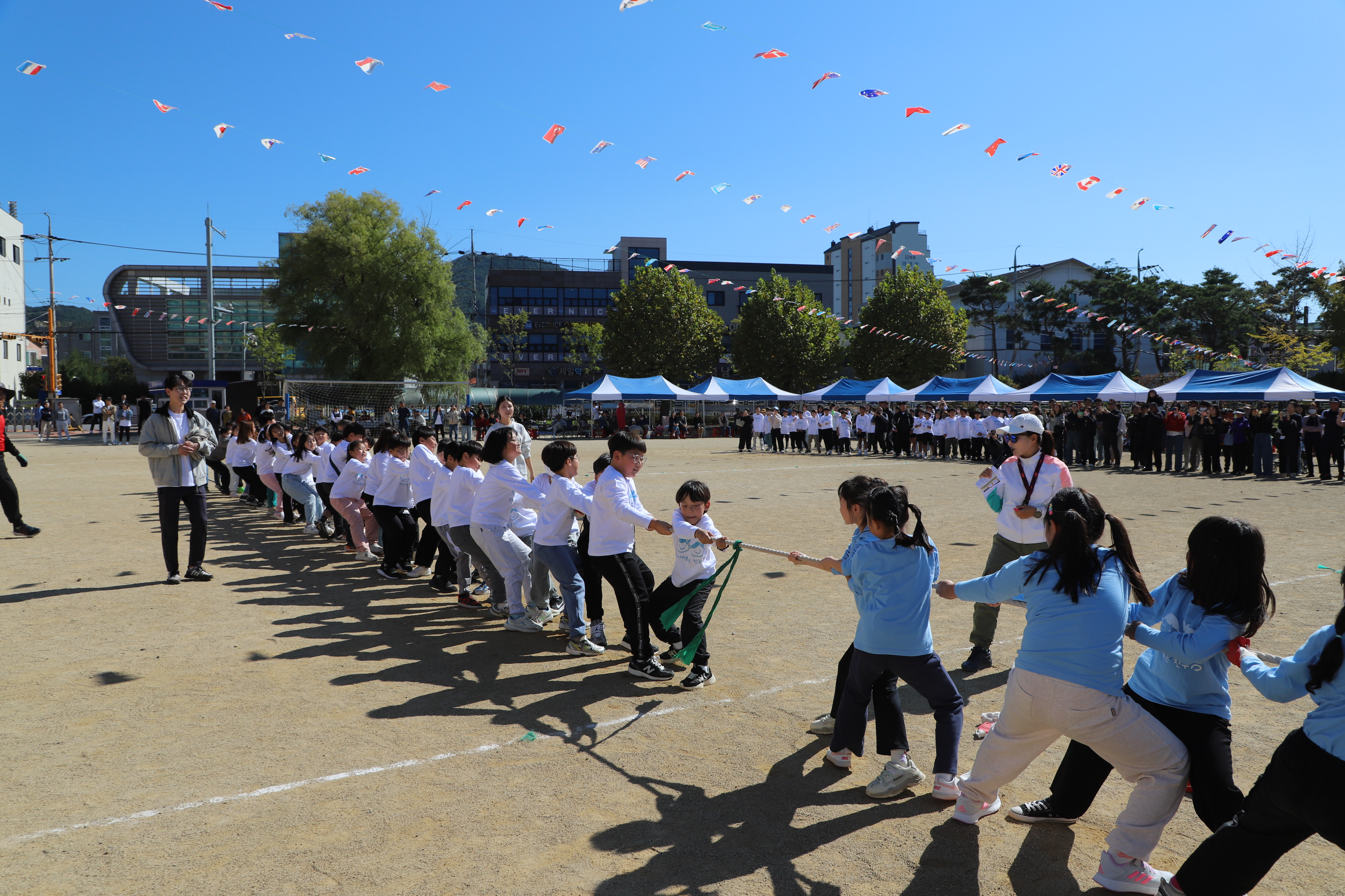 □ 가을 한마당 체육대회는 본교 병설유치원 원생들과 본교 5학년 학생의 식전 공연을 시작으로 다양한 경기(학년별 개인 달리기, 콩주머니 넣기, 줄다리기, 이어달리기 등)를 계획하여 이루어졌다. 각 팀을 응원하기 위한 응원전도 이루어졌다.