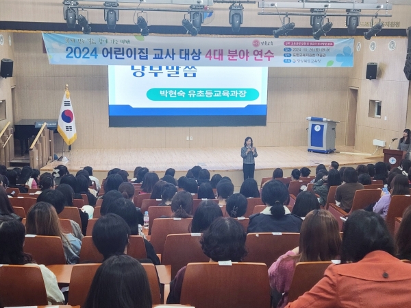 [금요저널] 경북교육청은 26일 포항교육지원청 여울관에서 포항과 경주, 영천, 경산 등 동부권역 10개 시군의 어린이집 교사 220여명을 대상으로 교육과정 실행과 영유아 정서발달 지원 역량 강화를 위한 연수를 실시했다.