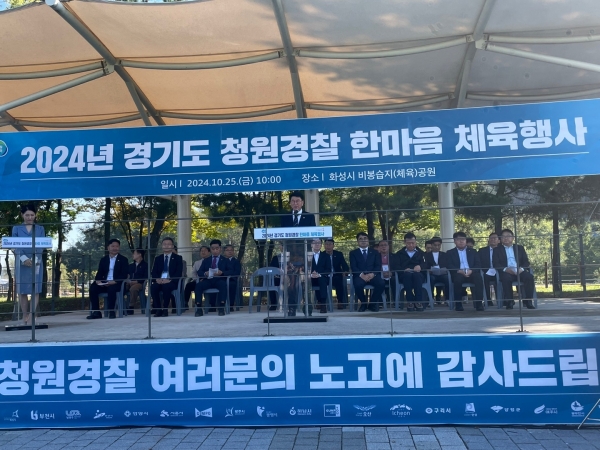 [금요저널] 경기도의회 안전행정위원회 윤성근 부위원장이 지난 25일 화성시 비봉습지체육공원에서 열린 ‘2024년 청원경찰 한마음 체육행사’에 참석해 축사를 통해 참가자들을 격려했다.