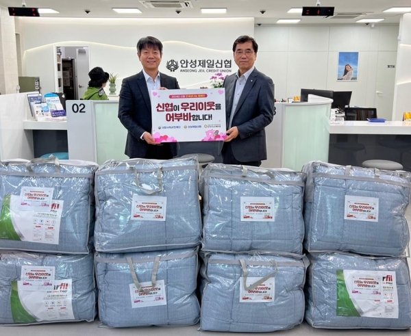 안성제일신협 김문수 이사장은 “날씨가 점차 추워지고 있는데 지역사회의 어려운 어르신들을 위해 겨울 이불을 전달할 수 있어서 기쁘고 온 세상 나눔 캠페인은 지역사회와 함께 울고 함께 웃는 신협의 가치를 잘 나타낸 대표적인 사회공헌활동으로 안성제일신협은 앞으로도 다양한 나눔활동으로 신협의 가치를 계속해서 실천하겠다”고 전했다.