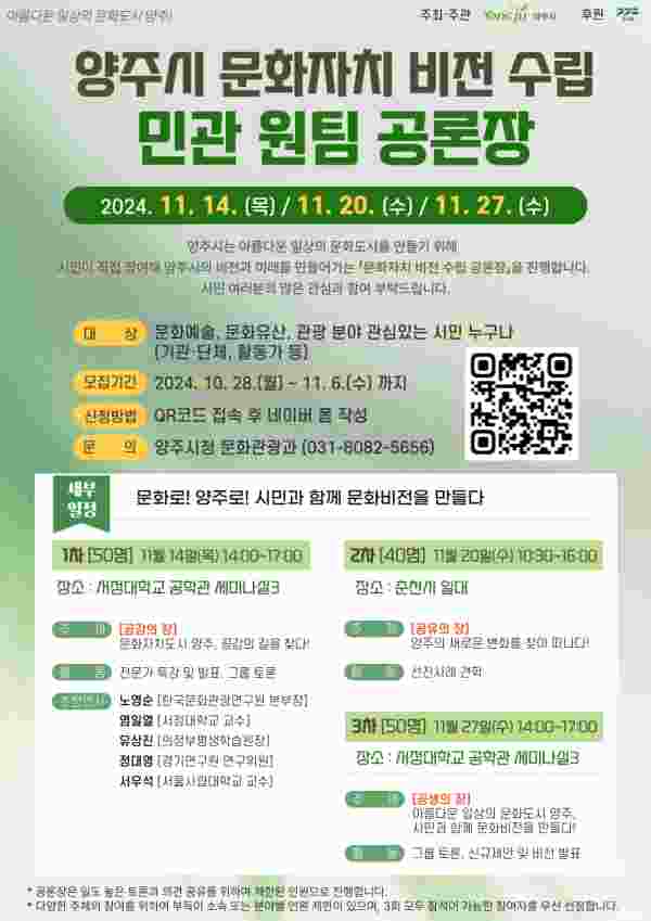 [금요저널] 양주시가 오는 11월 14일부터 총 3회에 걸쳐 열리는 ‘문화자치 비전 수립 민관 원팀 공론장’ 참가자를 모집한다고 밝혔다.