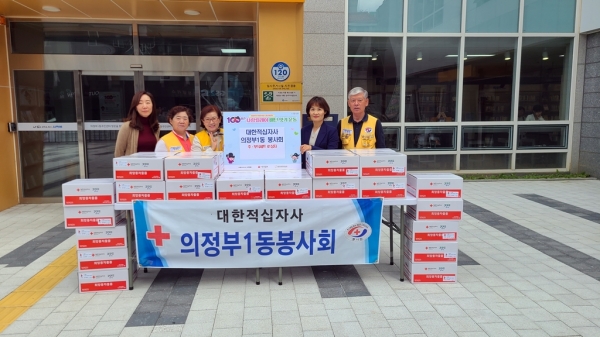 [금요저널] 의정부시 의정부1동주민센터는 10월 29일 의정부1동 적십자봉사회가 ‘100일간 사랑릴레이 배턴 잇기’에 동참해 즉석식품, 라면, 장조림 등이 담긴 주·부식 꾸러미 41상자를 기부했다고 밝혔다.