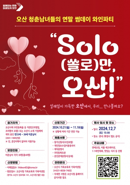 [금요저널] 오산시는 2024년 제3회 미혼남녀 만남행사“SOLO만 오산” 참가자를 11월 18일까지 공개 모집한다고 밝혔다.
