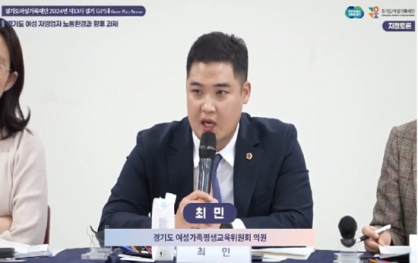 [금요저널] 경기도의회 여성가족평생교육위원회 최민 의원은 29일 경기도여성가족재단에서 개최한 ‘경기도 여성 자영업자 노동환경과 향후 과제 토론회’에 토론자로 참석해 ‘경기도 여성 자영업자의 노동환경 변화를 위한 정책적 제안’을 주제로 토론을 펼쳤다.