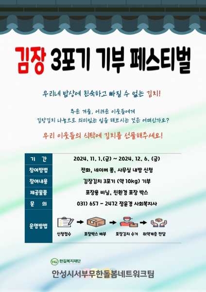[금요저널] 사회복지법인 한길복지재단에서 수탁 운영 중인 안성시서부무한돌봄네트워크팀은 오는 11월 1일부터 12월 6일까지 ‘김장 3포기 기부 페스티벌’ 행사에 동참할 안성시민, 지역기관·단체의 신청을 받는다.