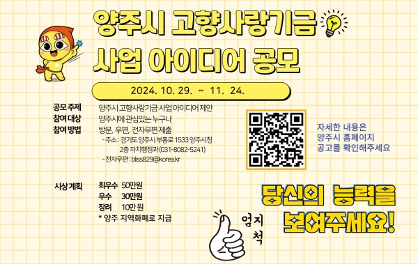 [금요저널] 양주시가 지역발전과 주민 삶의 질 향상을 위한 ‘고향사랑기금 사업 아이디어 공모’를 오는 24일까지 진행한다.