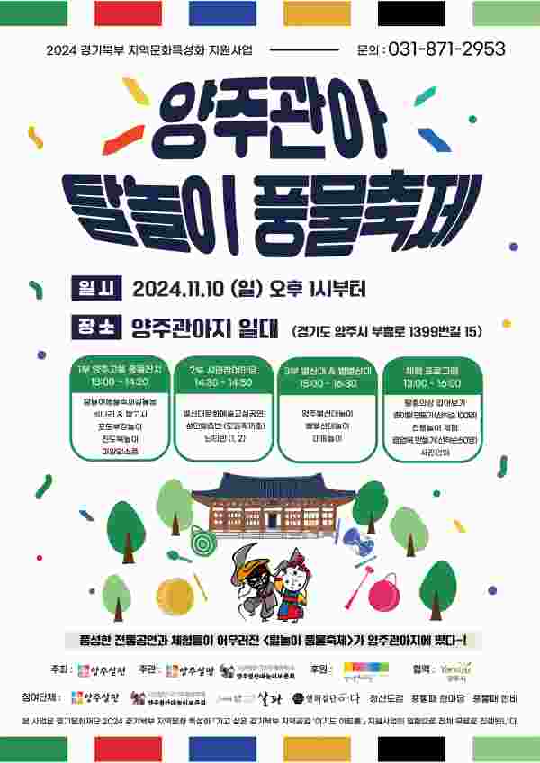 경기문화재단에서 시행하는 ‘2024년 경기북부 지역문화 특성화 지원사업’ ‘가고 싶은 경기북부 지역공감 ‘여기도 아트홀’’은 경기북부 10개 시군 문화예술단체를 대상으로 지역 불균형 등 다양한 사유로 문화 향유 기회가 적은 경기북부의 지역문화를 특성화해 지역 불균형을 해소하고자 추진하는 사업으로 올해 총 6개 사업이 최종 선정됐으며 양주에서는 양주살판의 ‘양주관아 탈놀이 풍물축제’ 가 선정됐다.