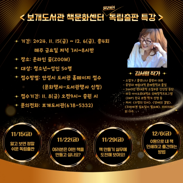 [금요저널] 안성시 보개도서관 책문화센터에서는 11월 15일부터 12월 6일까지 매주 금요일 저녁 7시에 온라인 특강을 진행한다.