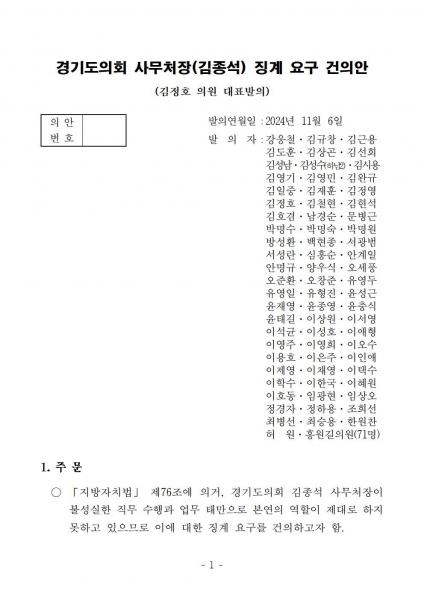[금요저널] 경기도의회 국민의힘이 7일 ‘경기도의회 사무처장 징계 요구 건의안’을 발의했다고 밝혔다.