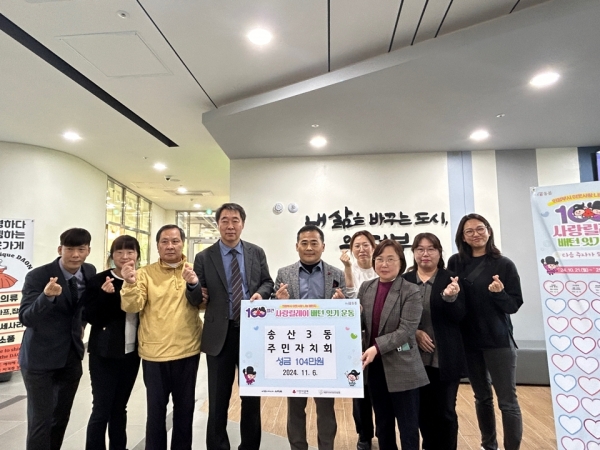 [금요저널] 의정부시 송산3동행정복지센터는 11월 6일 송산3동 주민자치회가 어려운 이웃을 돕기 위한 ‘100일간 사랑릴레이 배턴 잇기’에 동참해 성금 104만원을 기탁했다고 밝혔다.