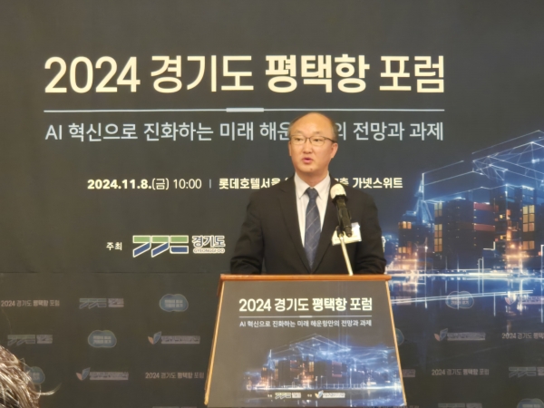 [금요저널] 경기도의회 건설교통위원회 김동영 부위원장이 8일 소공동 롯데호텔 가넷스위트에서 열린 ‘2024 경기도 평택항 포럼’에 참석해 평택항의 미래성장과 스마트 항만으로 도약을 위한 혁신을 강조하는 축사를 전했다.
