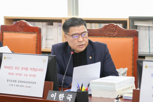 [금요저널] 경기도의회 문화체육관광위원회 이한국 의원이 12일 진행된 경기문화재단·경기아트센터 행정사무감사에서 문화·예술향유를 위해 노력하는 경기아트센터 실무 직원들은 칭찬하고 안일하게 업무에 대응하는 경영진을 강력히 질타했다.