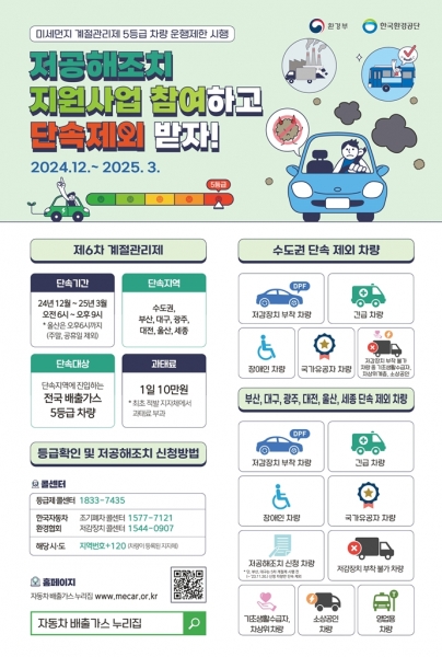 또한, 5등급 차량 소유자는 시·도별로 운행 제한 조건, 제외 대상 등 단속 조건이 달라 타지역을 방문할 때는 ‘자동차 배출가스 등급제’ 누리집에서 해당 지역의 제한 조건을 반드시 확인해야 한다.