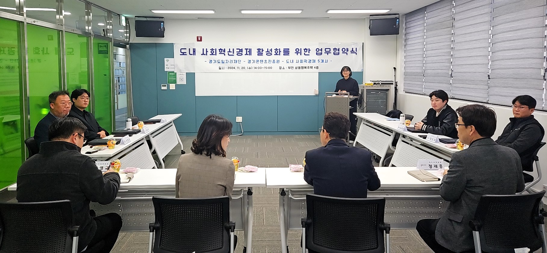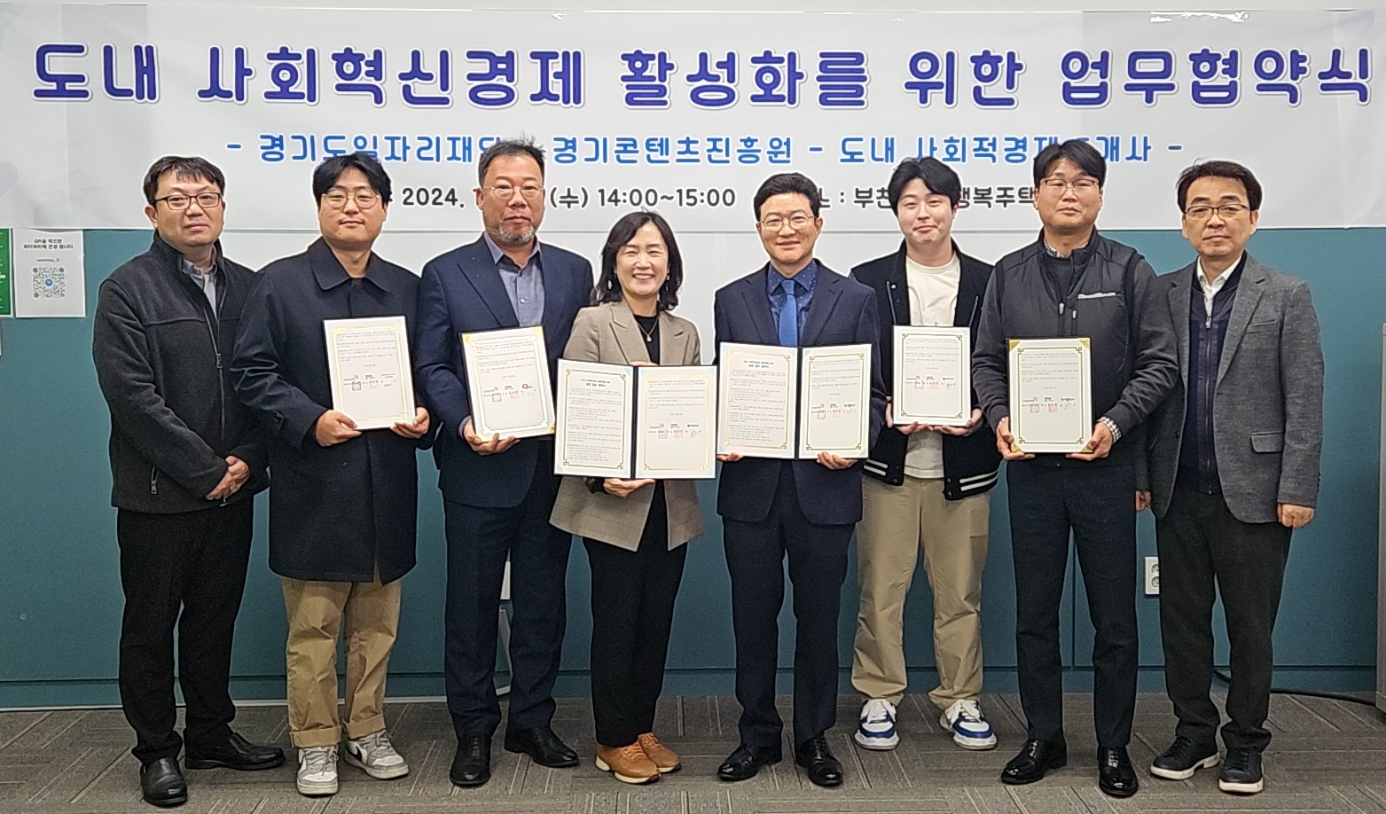 경기도일자리재단(이하 재단)은 20일 부천시사회적경제센터에서 경기콘텐츠진흥원(이하 진흥원) 및 도내 사회적경제조직 5개사와 함께 ‘사회혁신경제 활성화를 위한 공동협력 업무협약식’을 개최했다.