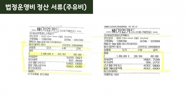 이어서 “지난해 마지막으로 사용한 운영비는 주유비이던데, 운영비 예산 4천 300만원을 맞추기 위해 집행부가 꼼수를 부렸다”고 말하며 “예산 잔액과 주유비가 어떻게 정확히 일치할 수 있는지 도무지 이해되지 않는다”며 “이는 운영비 잔액, 단 50원도 남기지 않으려고 ‘주유깡’ 이라 불리는 부정수급이 의심된다”고 꼬집었다.