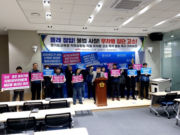 [금요저널] 경기도의회 더불어민주당 소속 유호준 의원이 2024년 11월 21일 경기도의회에서 전국공무원노동조합 경기도교육청 지부와 함께 기자회견을 열고 경기도교육청 직무감찰팀의 무분별한 고소 사태를 강하게 규탄하며 노동조합 및 지방공무원의 권리를 보호할 것을 촉구했다.