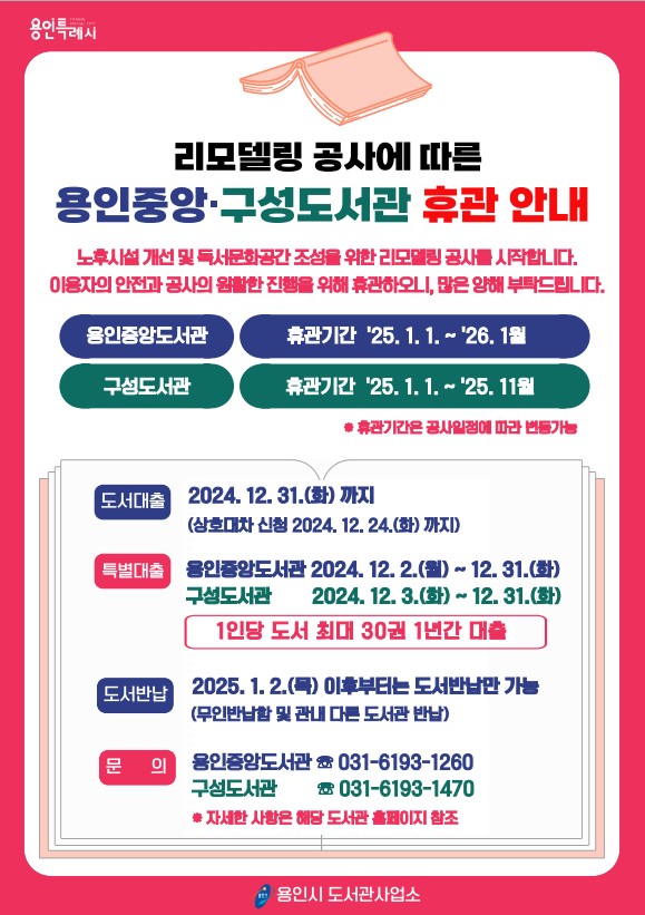 [금요저널] 용인특례시는 용인중앙도서관과 구성도서관이 리모델링 공사로 2025년 1월 1일부터 휴관에 들어간다고 22일 밝혔다.
