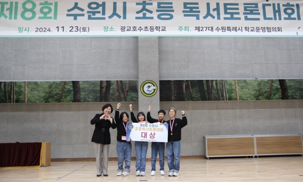 이날 제8회 수원시 초등 독서토론대회 대상은 망포초등학교 ‘별하나르샤’팀, 금상은 광교호수초등학교 ‘고래들’팀, 은상은 산성초·영덕초등학교 연합 ‘신성한 토론A’팀, 동상을 송림초등학교 ‘책의 마법사들’팀이 수상하는 등 14개 팀이 수상의 영광을 안았다.