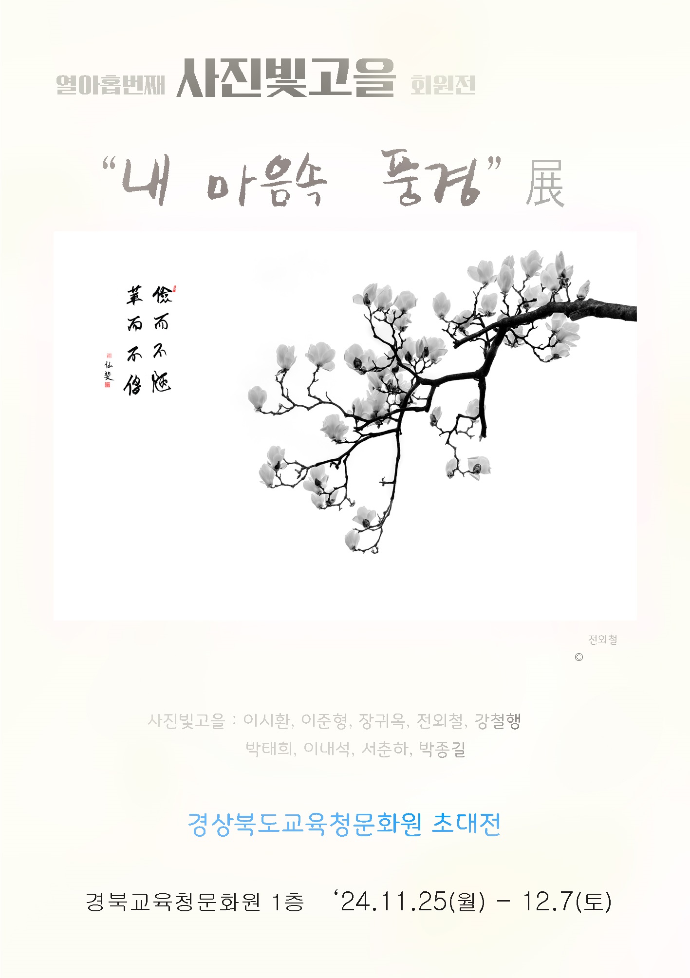 경상북도교육청문화원(원장 박민아)은 이달 25일부터 12월 7일까지 사진빛고을의 열한번째 회원전인‘내 마음속 풍경’전을 1층 전시실에서 개최한다.