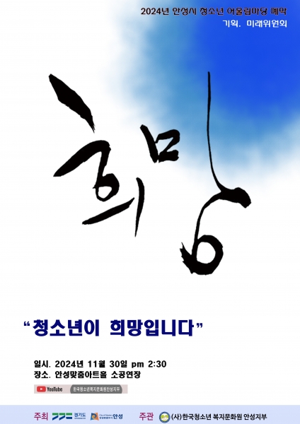 [금요저널] ‘희망’을 부제로 청소년들의 다양한 끼와 재능을 발휘하게 될 2024 안성시청소년어울림마당 폐막식이 오는 11월 30일 오후 2시 30분 안성맞춤아트홀 소공연장에서 펼쳐진다.