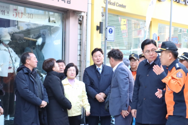 최종현 대표의원은 이날 이용욱 총괄수석, 고은정 경제노동위원장, 김옥순 소통·협력부대표 등과 함께 도깨비시장 아케이드 붕괴 현장을 둘러보고 피해복구 현황에 대해 보고받았다.