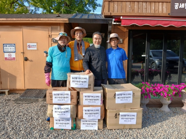 용인시민농장 관리원들은 시민에게 분양하고 남은 자투리땅에서 기른 감자, 생강, 토란, 고구마, 무, 배추 등 농산물 5kg 100박스를 기탁했다.