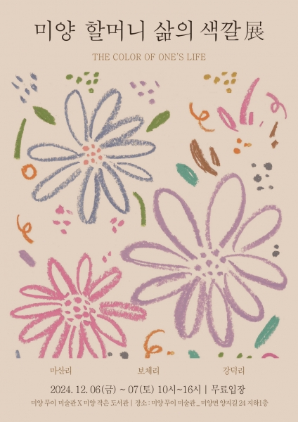 [금요저널] 안성시 미양작은도서관은 무이미술관에서 2024년 12월 6일부터 7일까지 마을 어르신들의 작품 전시회 ‘미양 할머니 삶의 색깔 展’을 개최한다.